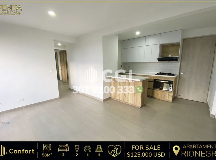 155-11-248 Apartamento disponible para la venta ubicado en tranquila zona de Rionegro. Este cuenta con un área de 58.25mt², distribuidos en sala-comedor, conectada con cocina integral funcional, balcón, además dispone de una zona de ropa bien distribuida, el apartamento cuenta con 1 baño social, 2 habitaciones, cada una con closet y la principal con baño, la propiedad incluye un parqueadero cubierto y cuarto útil. Ubicado en unidad residencial con seguridad 24/7 y ofrece comodidades como piscina climatizada, gimnasio, salón social, zona de juegos, área de yoga y lectura, y placa polideportiva, cercana a la pesca Tesorito y parque Remansos, con vías de acceso por la Carrera 51c. CONFORT GESTORES INMOBILIARIOS – Arriendo en Rionegro