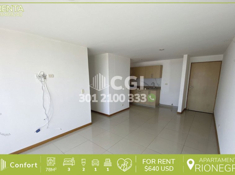 204-09-248 Apartamento disponible para la renta en excelente zona de Rionegro, Antioquia., cuenta con un área de 78 m², distribuidos en sala comedor, cocina semi integral, balcón con excelente iluminación, 3 habitaciones, una de ellas con baño privado, 2 con clóset y una con vestier, baño social, zona de estudio, parqueadero cubierto y cuarto útil. Ubicado en unidad con seguridad privada 24/7 y zonas comunes tales como piscina, salón social, cancha polideportiva, zona infantil, turco y sauna, cercano al Smart Academia de Idiomas y al Politécnico Jaime Isaza Cadavid, con vías de acceso por la cra 51 y gran variedad de rutas de transporte público. CONFORT GESTORES INMOBILIARIOS – Arriendo en Rionegro