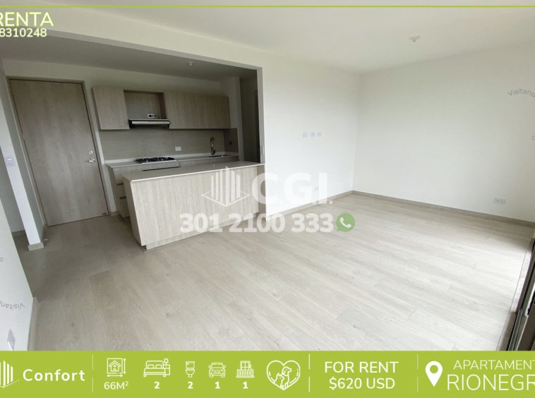 83-10-248 Excelente apartamento disponible para la renta en Rionegro, Antioquia., cuenta con un área de 66m², distribuidos en sala comedor, cocina integral, zona de ropa, balcón, baño social, 2 habitaciones, una con clóset y la habitación principal con vestier y baño privado, parqueadero cubierto y cuarto útil. Ubicado en unidad con seguridad privada 24/7 y zonas comunes tales como piscina climatizada, gimnasio, salón social, zona de juegos, área de yoga, lectura y placa polideportiva, a sus alrededores podemos encontrar La Pesca Tesorito y el parque Remansos, con vía de acceso por la carrera 51c y gran variedad de rutas de transporte público. CONFORT GESTORES INMOBILIARIOS – Arriendo en Rionegro