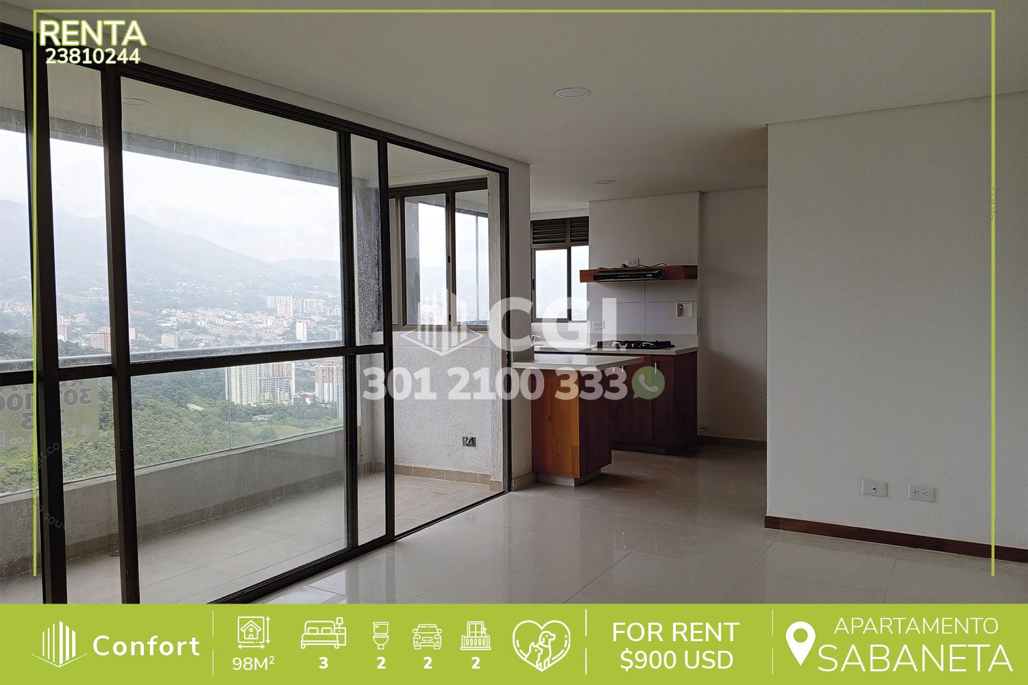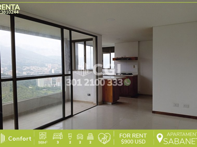238-10-244 Inmobiliaria en Medellín arrienda apartamento ubicado en tranquilo sector de Sabaneta, cuenta con 98mt2 distribuidos en sala comedor de muy buen espacio, cocina integral con barra americana, zona de ropas, balcón, 3 habitaciones, una de ellas con baño privado, vestier y balcón, baño social, 2 parqueaderos y cuarto útil. Ubicado en unidad con seguridad 24/7 y con zonas comunes en construcción, a su alrededor podemos encontrar el Éxito de Sabaneta, hospital de Sabaneta y el Mall del Sur, con rutas de acceso por las avenidas El Poblado, Las Vegas y gran variedad de rutas de transporte público. CONFORT GESTORES INMOBILIARIOS – Arriendo en Sabaneta