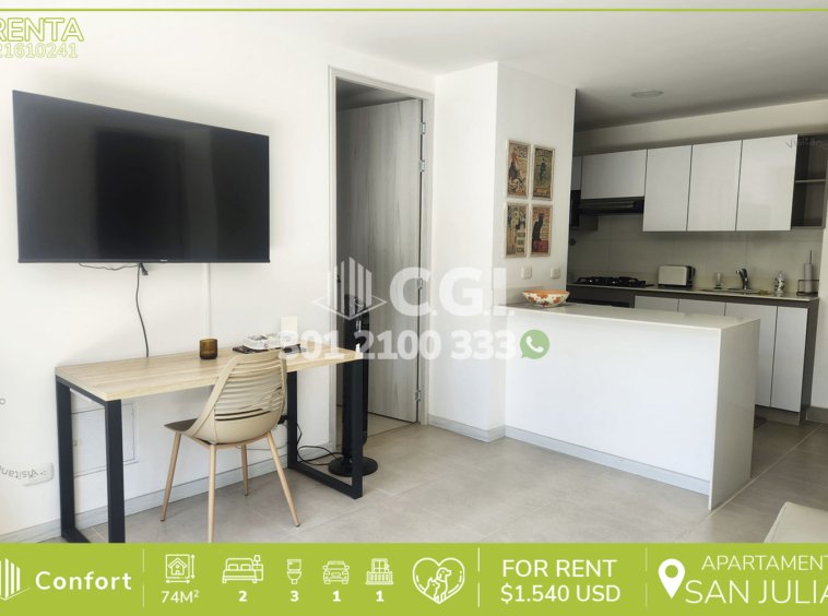 216-10-241 Inmobiliaria en Medellín arrienda apartamento ubicado en el sector de San Julian en El Poblado, cuenta con 74 mt2 distribuidos en sala comedor, cocina integral, 2 habitaciones, 2 de ellas con baño privado y vestier, balcón, baño social y parqueadero. Ubicado en unidad con seguridad privada 24/7 y con zonas comunes en construcción como piscina, turco, gimnasio, parque infantil y zonas verdes, a su alrededor podemos encontrar el centro comercial Automotriz y Telemedellín, con vías de acceso por las avenidas El Poblado, Las Palmas y gran variedad de rutas de transporte público. CONFORT GESTORES INMOBILIARIOS – Arriendo en El Poblado