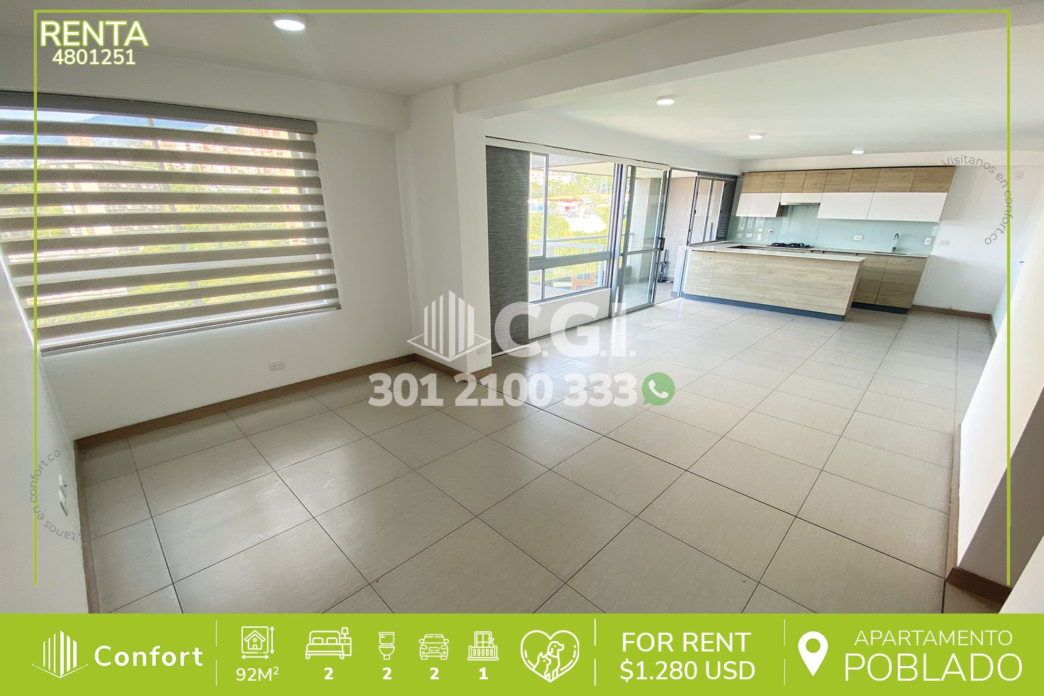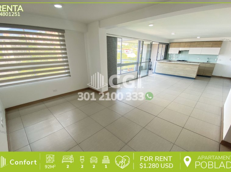 48-01-251 Inmobiliaria en Medellín arrienda apartamento ubicado en el sector de San Julián en El Poblado, cuenta con un área de 92mt2 distribuidos en sala comedor, cocina integral con barra americana, balcón con vista panorámica, 2 habitaciones, una de ellas con clóset y la habitación principal con baño privado y vestier, baño social, parqueadero doble lineal y cuarto útil. Ubicado en edificio con seguridad privada 24/7 y zonas comunes como piscina, gimnasio, turco, cancha de baloncesto y parque infantil, a su alrededor podemos encontrar el centro comercial Premium Plaza, Mall Bora Bora e IPS SURA, con vías de acceso por la avenida El Poblado, Las Palmas y gran variedad de transporte público. CONFORT GESTORES INMOBILIARIOS – Arriendo en El Poblado