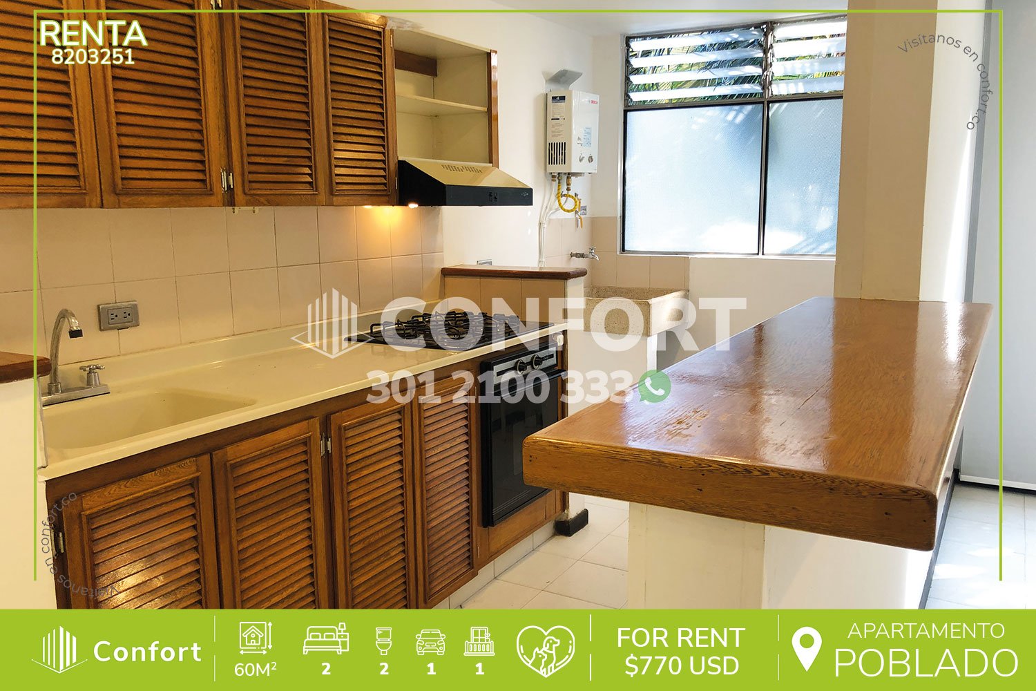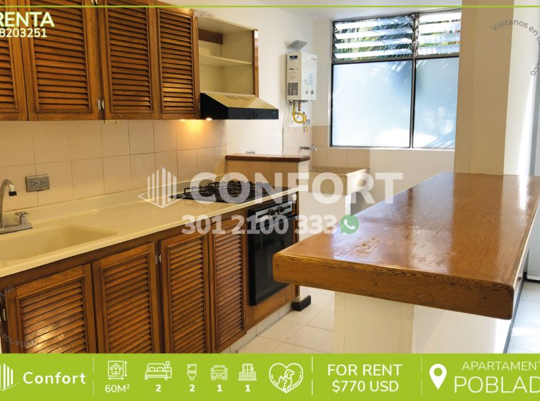 82-03-251 Inmobiliaria en Medellín arrienda apartamento ubicado en el sector de San Julián en El Poblado, cuenta con un área de 60mts distribuidos en sala comedor, cocina integral con barra americana, 2 habitaciones con clóset, una de ellas con balcón y baño privado, baño social y parqueadero. Ubicado en unidad cerrada con seguridad privada 24/7, zona BBQ, kiosko, zona infantil y zonas verdes, a su alrededor podemos encontrar el centro comercial San Diego, centro comercial Premium Plaza y Mall El Indio, con vías de acceso por las avenidas Las Palmas, El Poblado, la 30 y amplia variedad de rutas de transporte público. CONFORT GESTORES INMOBILIARIOS – Arriendo en El Poblado