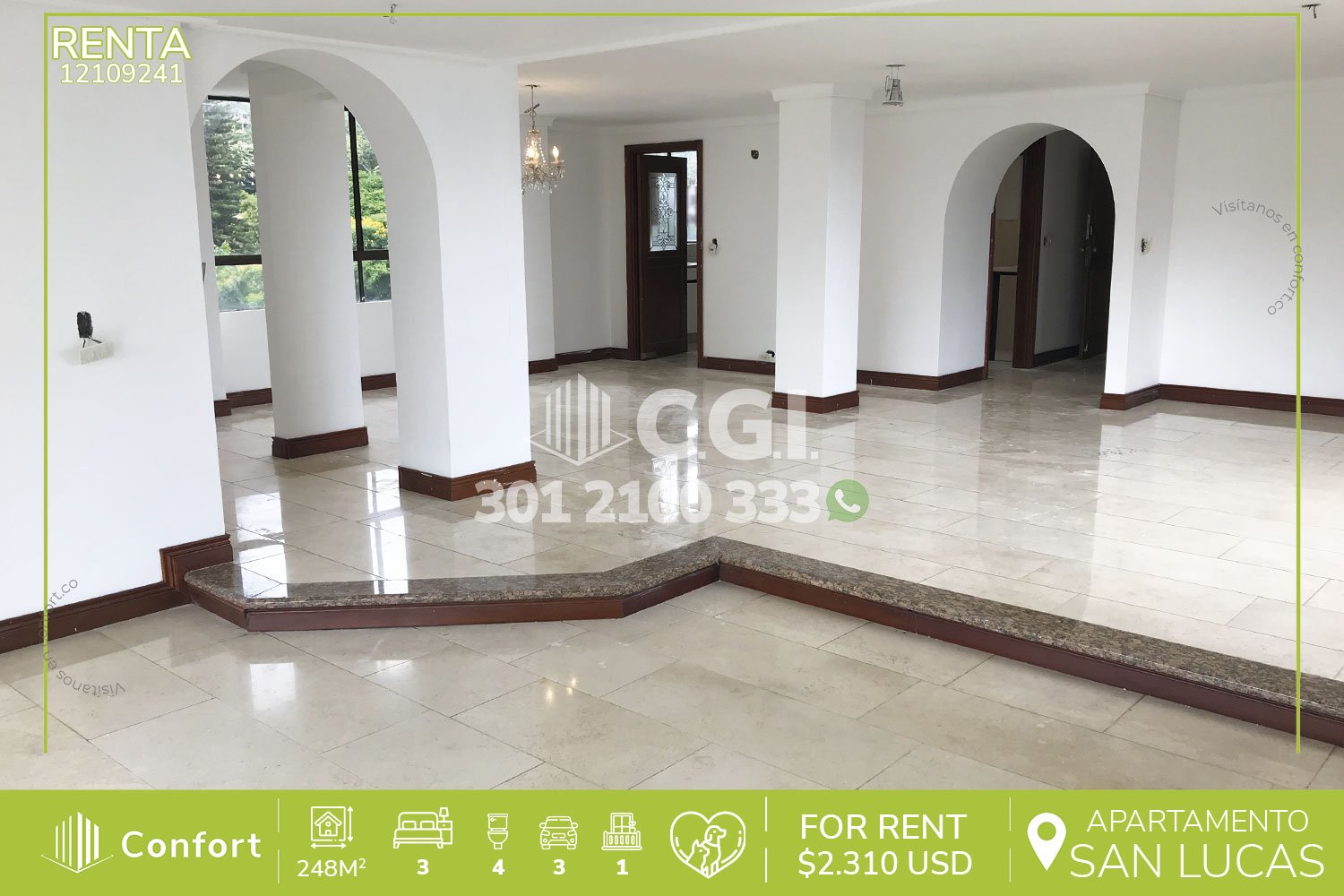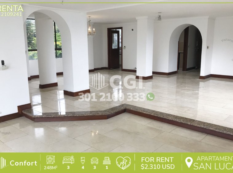 121-09-241 Inmobiliaria en Medellín arrienda apartamento ubicado en tranquilo sector de San Lucas en El Poblado, cuenta con 248mt2 distribuidos en sala comedor de muy buen espacio, cocina integral, zona de ropas, 3 habitaciones, 2 de ellas con baño privado y vestier y otra con clóset, 2 baños sociales, habitación de servicio con su respectivo baño privado, 3 parqueaderos y cuarto útil. Ubicado en edificio con seguridad privada 24/7 y zonas verdes, a su alrededor podemos encontrar el Mall San Lucas, Carulla y Farmatodo, con rutas de acceso por la transversal inferior, calle 20 b sur y gran variedad de rutas de transporte público. CONFORT GESTORES INMOBILIARIOS – Arriendo en El Poblado