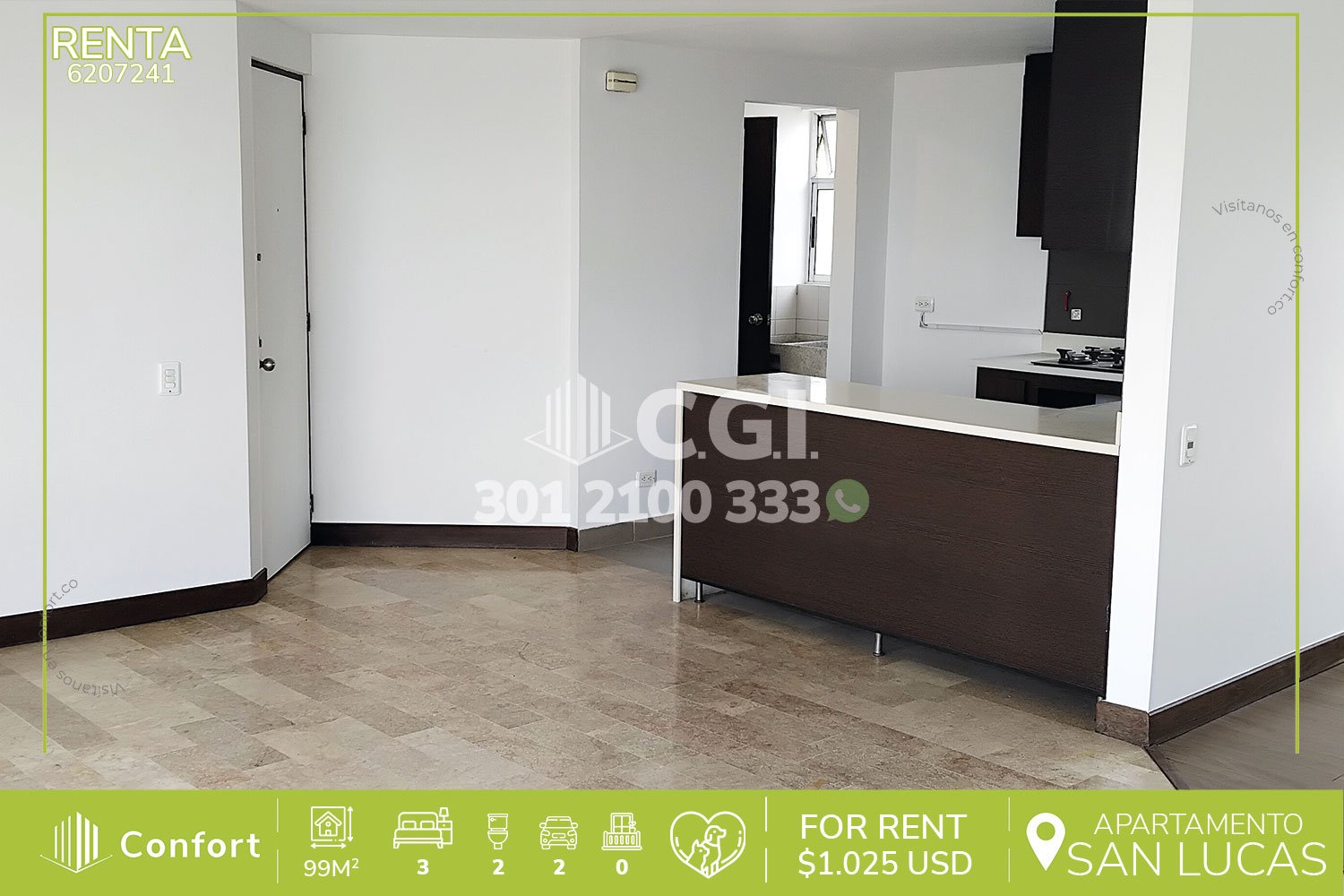 62-07-241 Inmobiliaria en Medellín arrienda apartamento en El Poblado, el cual cuenta con un área de 99mts2 distribuidos en sala comedor, cocina integral, zona de ropas, 3 habitaciones, 1 habitación de servicio, espacio para biblioteca o sala de star, 2 baños, vestier, 2 parqueaderos y cuarto útil. Ubicado en edificio con seguridad privada 24/7 y zonas comunes como salón social y parque infantil, a su alrededor podemos encontrar Carulla, Centro Comercial City Plaza y Centro Comercial El Tesoro, con vías de acceso como avenida El Poblado, avenida Las Vegas, transversal inferior y gran variedad de rutas de transporte público. CONFORT GESTORES INMOBILIARIOS – Arriendo en El Poblado
