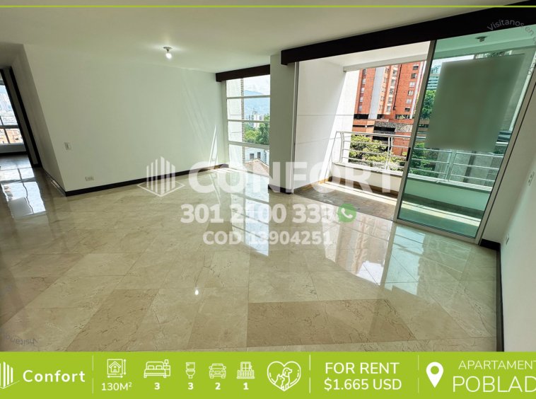 139-04-251 Inmobiliaria en Medellín arrienda apartamento ubicado en el tranquilo sector de Santa María de Los Ángeles en El Poblado, cuenta con un área de 130mt2 distribuidos en sala comedor, cocina integral, zona de ropas, balcón, 3 habitaciones, una de ellas con baño privado y vestier, 2 con clóset, 2 baños sociales, sala de estudio, habitación de servicio con su respectivo baño, 2 parqueaderos y cuarto útil. Ubicado en edificio con seguridad privada 24/7 y zonas comunes como piscinas para niños y adultos, salón social, gimnasio, turco y parque infantil, a su alrededor podemos encontrar el parque conmemorativo Inflexión, São Paulo Plaza y Mall La Frontera, con vías de acceso por las avenidas El Poblado, Las Vegas y gran variedad de rutas de transporte público. CONFORT GESTORES INMOBILIARIOS – Arriendo en El Poblado