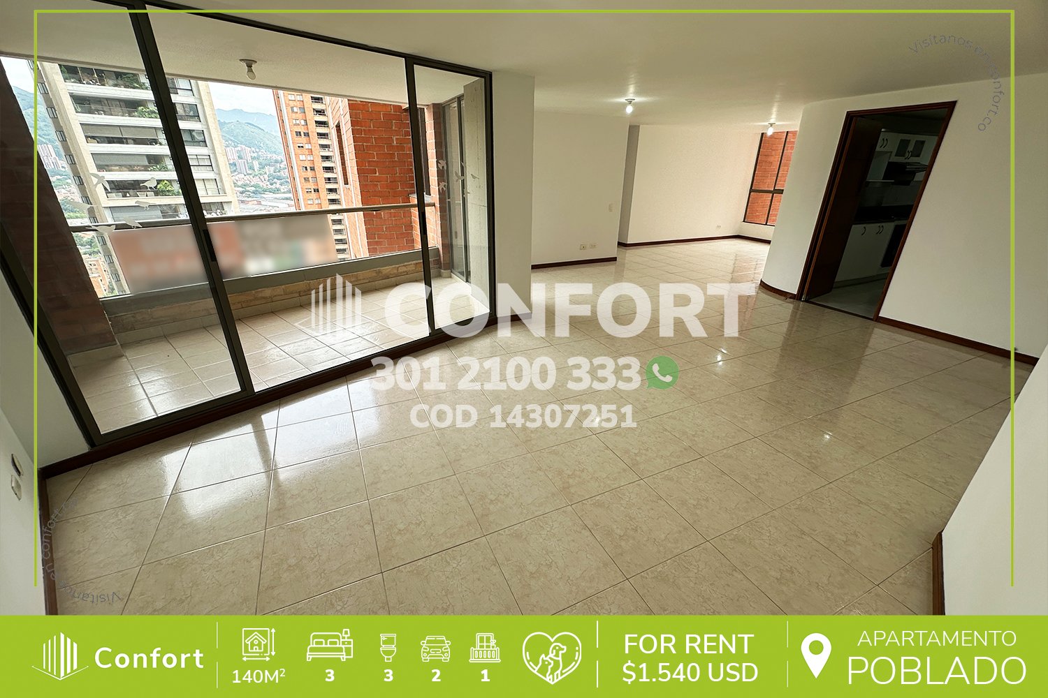 143-07-251 Inmobiliaria en Medellín arrienda apartamento ubicado en el sector de Santa María de Los Ángeles en El Poblado, cuenta con un área de 140mt2 distribuidos en sala de muy buen tamaño, comedor, cocina integral, zona de ropas, balcón, 3 habitaciones, 2 de ellas con baño privado, una con vestier, 2 con clóset, sala de estudio, baño social, 2 parqueaderos y cuarto útil. Ubicado en edificio con seguridad privada 24/7 y zonas comunes tales como piscina para niños y adultos, salón social, gimnasio, jacuzzi, placa polideportiva, cancha de squash y zonas verdes, a su alrededor podemos encontrar la parroquia Santa María, parque de Santa María y Farmatodo, con vías de acceso por las avenidas El Poblado, Las Vegas y gran variedad de transporte público. CONFORT GESTORES INMOBILIARIOS – Arriendo en El Poblado