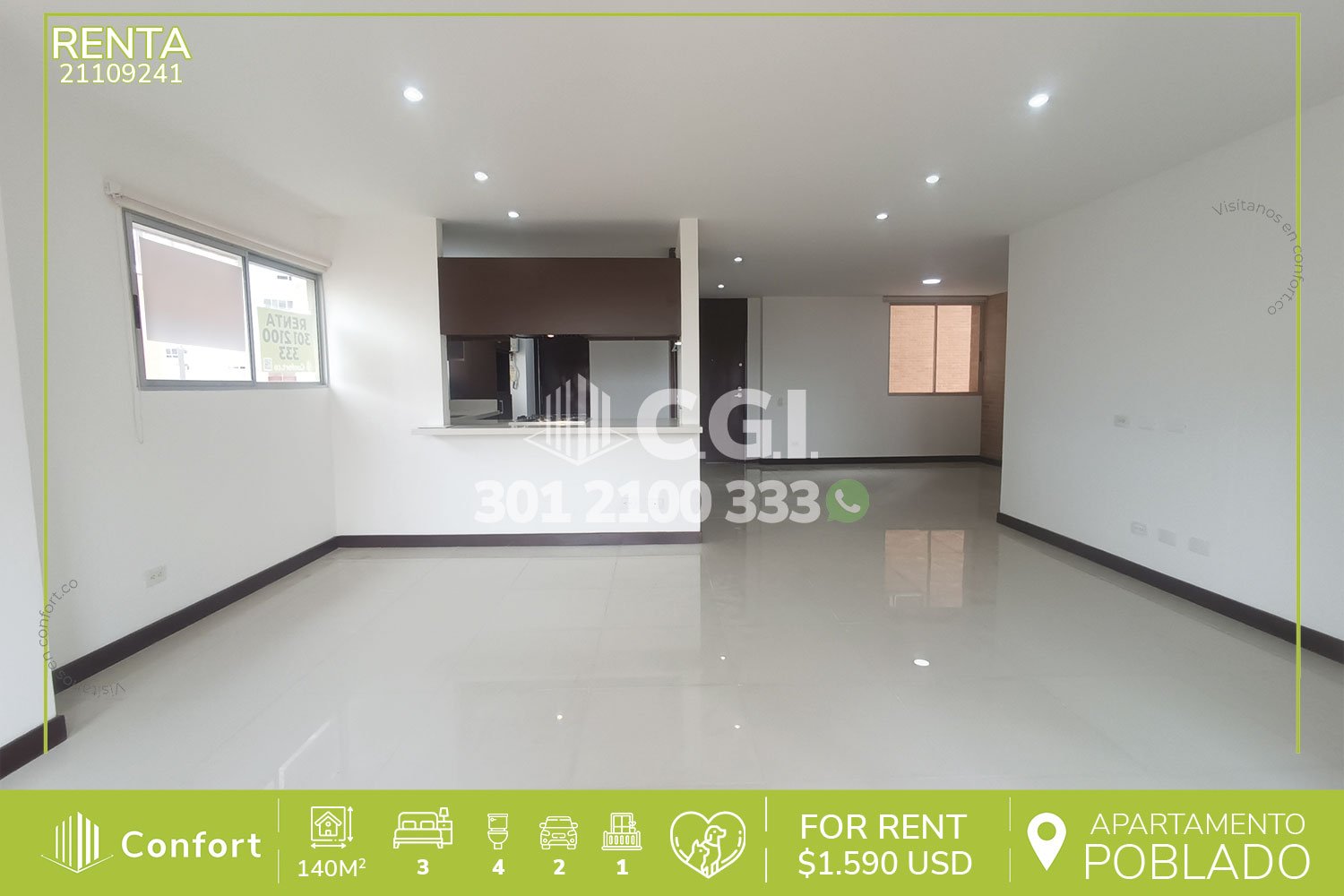 211-09-241 Inmobiliaria en Medellín arrienda apartamento ubicado en excelente sector de Santa María de Los Ángeles en El Poblado, cuenta con un área de 140mt2 distribuidos en sala comedor espaciosa, cocina integral con lavavajillas, zona de ropa, habitación de servicio con baño privado, 3 habitaciones de excelente tamaño cada una con su respectivo clóset y baño privado, adicional podemos encontrar un baño social, amplio balcón con agradable vista, 2 parqueaderos y cuarto útil. Ubicado en edificio con seguridad 24/7 y con zonas de esparcimiento como terraza, área de BBQ, salón social, parque infantil y zona pet, a su alrededor podemos encontrar Mall La Frontera, Euro Supermercados y parque Santa María 2, con vías de acceso por las avenidas El Poblado, Las Vegas y gran variedad de rutas de transporte público. CONFORT GESTORES INMOBILIARIOS – Arriendo en El Poblado