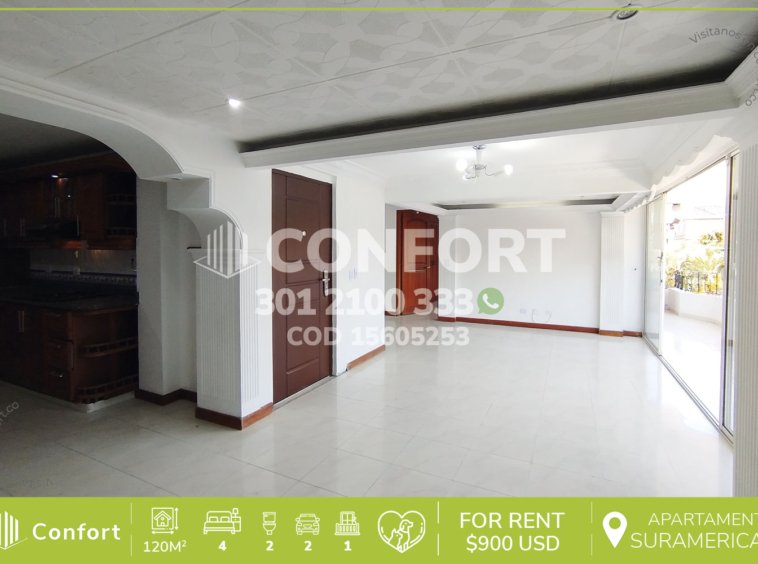 156-05-253 Inmobiliaria en Medellín arrienda apartamento ubicado en el sector de Suramericana, cuenta con un área de 120mt2 distribuidos sala comedor, cocina integral, balcón, zona de ropas, 4 habitaciones con clóset, 2 de ellas con baño privado, baño social, garaje para 2 vehículos y cuarto útil. A su alrededor podemos encontrar el Éxito de Colombia, Estadio y  Jumbo de La 65, con vías de acceso por la cra 65, avenida Colombia y gran variedad de transporte público. CONFORT GESTORES INMOBILIARIOS – Arriendo en Medellín