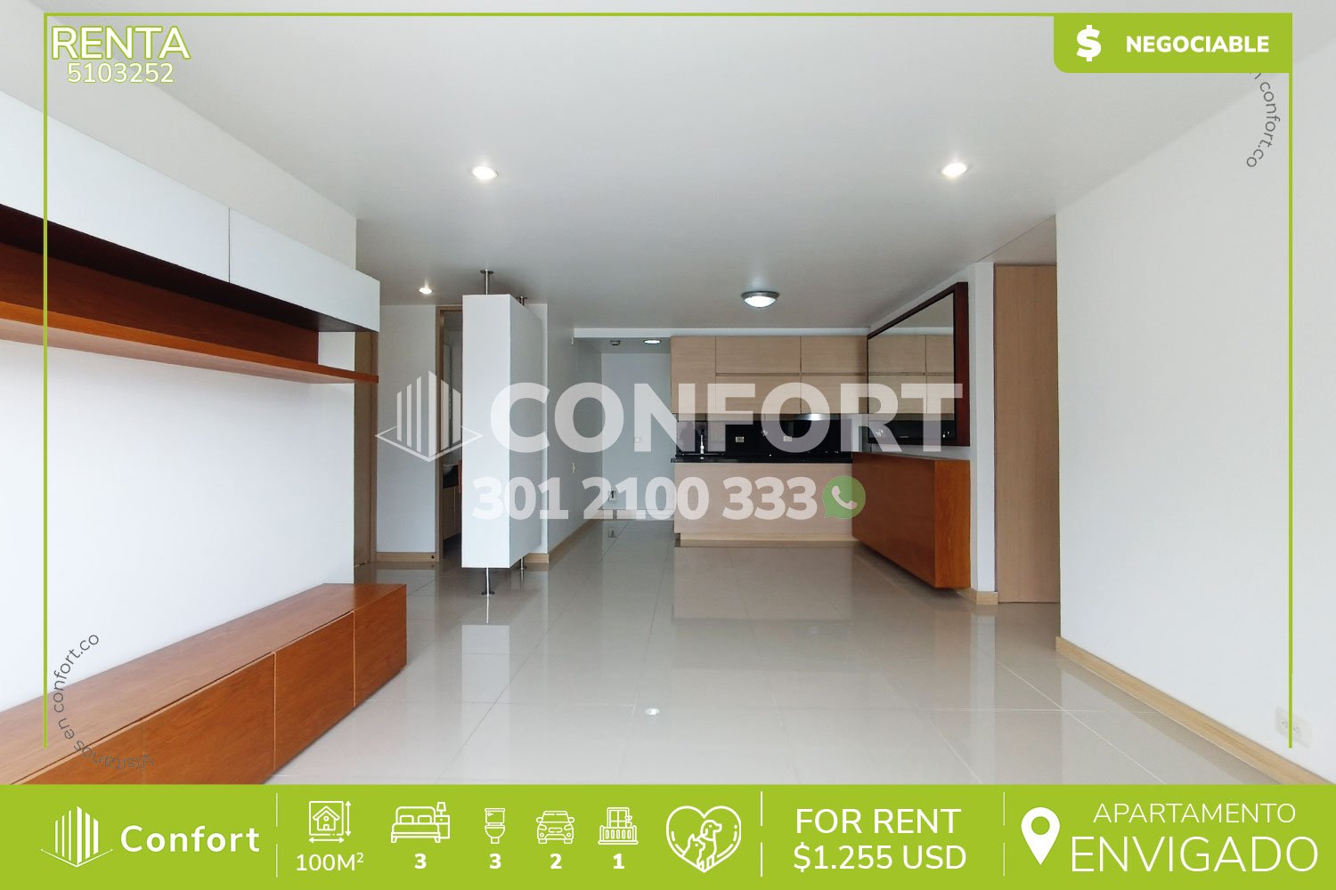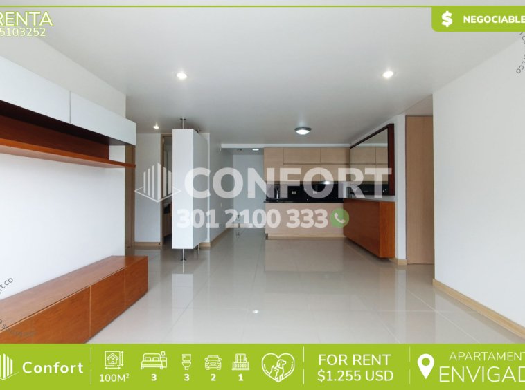 51-03-252 Inmobiliaria en Medellín arrienda apartamento ubicado en excelente sector de Villa Grande en Envigado, cuenta con un área de 100mt2 distribuidos en sala comedor espaciosa, cocina integral moderna, zona de ropas, 3 habitaciones de excelente tamaño, la habitación principal cuenta con vestier y baño privado, adicional podemos encontrar 2 baños sociales, área de estudio, amplio balcón con agradable vista, parqueadero doble lineal y cuarto útil. Ubicado en urbanización con seguridad privada 24/7 y con zonas comunes como piscina, salón social, gimnasio, cancha de squash y placa polideportiva, a su alrededor podemos encontrar Viva Envigado y Señor Gol, con vías de acceso por las avenidas El Poblado, Las Vegas y amplia variedad de rutas de transporte público. CONFORT GESTORES INMOBILIARIOS – Arriendo en Envigado