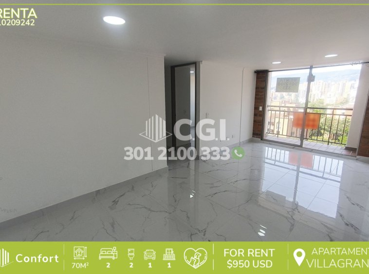 102-09-242 Inmobiliaria en Medellín arrienda apartamento ubicado en excelente sector de Villagrande en Envigado, cuenta con un área de 70mt2 distribuidos en sala comedor espaciosa, cocina integral moderna, zona de ropas, 2 habitaciones de excelente tamaño, cuya habitación principal cuenta con clóset doble y baño privado, adicional podemos encontrar baño social, balcón con atractiva vista, parqueadero y cuarto útil. Ubicado en urbanización con seguridad 24/7 y con zonas de esparcimiento como piscinas, parque infantil y salón social; a su alrededor podemos encontrar el Viva Envigado, Señor Gol y Museo Otraparte, con vías de acceso por las avenidas El Poblado, Las Palmas y amplia variedad de rutas de transporte público. CONFORT GESTORES INMOBILIARIOS – Arriendo en Envigado