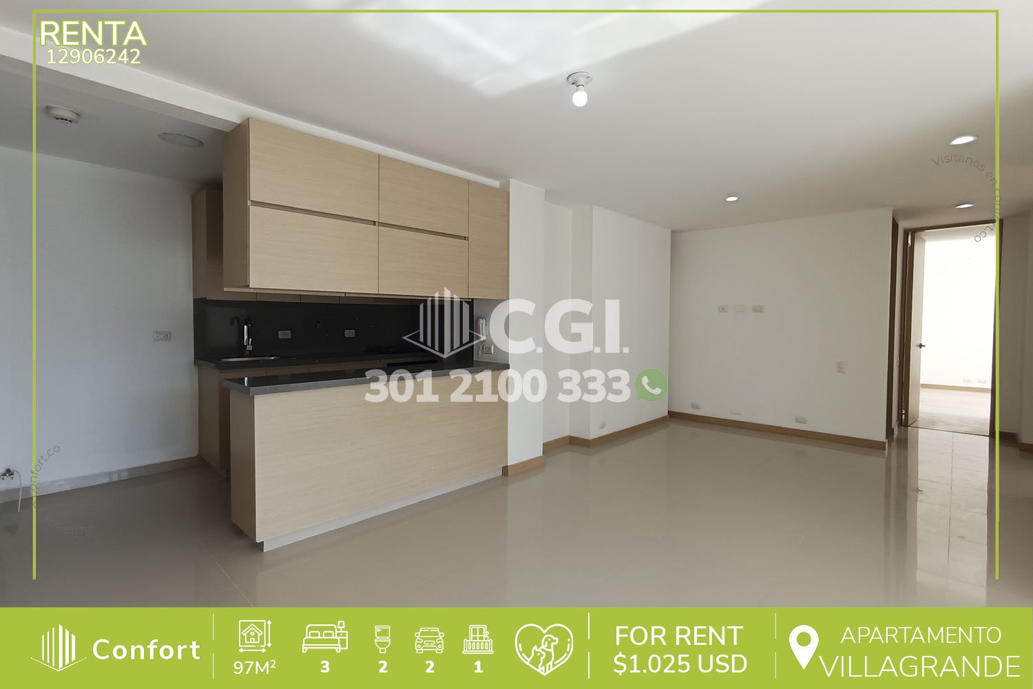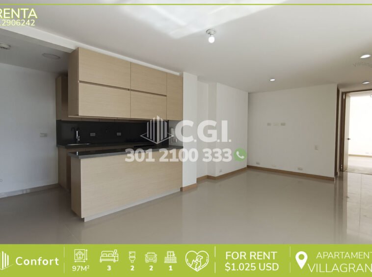 129-06-242 Hermoso y moderno apartamento disponible para la renta ubicado en excelente sector de Villagrande en Envigado, cuenta con un área de 97mt2 distribuidos en sala comedor espaciosa e iluminada, cocina integral moderna, zona de ropas, 3 habitaciones de excelente tamaño, la habitación principal cuenta con vestier y baño privado, adicional podemos encontrar un baño social y amplio balcón con agradable vista, 2 parqueaderos y cuarto útil. Ubicado en urbanización con seguridad 24/7 y zonas de esparcimiento como piscinas, salón social, parque infantil, cancha de fútbol, cancha de squash, gimnasio y zona pet; a su alrededor podemos encontrar Viva Envigado, Señor Gol y Museo Otraparte, vías de acceso por Avenida El Poblado, Avenida Las Vegas y gran variedad de rutas de transporte público. CONFORT GESTORES INMOBILIARIOS – Arriendo en Envigado