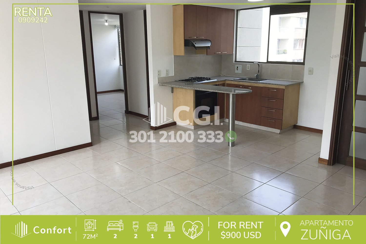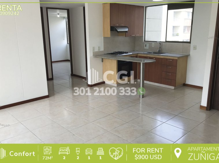 09-09-242 Inmobiliaria en Medellín arrienda acogedor apartamento en tranquilo sector de Zúñiga en Envigado, cuenta con 72mt2 distribuidos en sala comedor, balcón, cocina integral con barra americana, zona de ropas, 2 habitaciones, una de ellas con baño privado y vestier, clóset, baño social, parqueadero y cuarto útil. Ubicado en edificio con seguridad privada 24/7 y con zonas comunes tales como piscina para niños y adultos, gimnasio, salón social, turco y juegos infantiles, a su alrededor podemos encontrar Sao Paulo Plaza, Euro La Frontera y Mall Villa Grande, con rutas de acceso por las avenidas El Poblado, Las Vegas y amplia variedad de rutas de transporte público. CONFORT GESTORES INMOBILIARIOS – Arriendo en Envigado