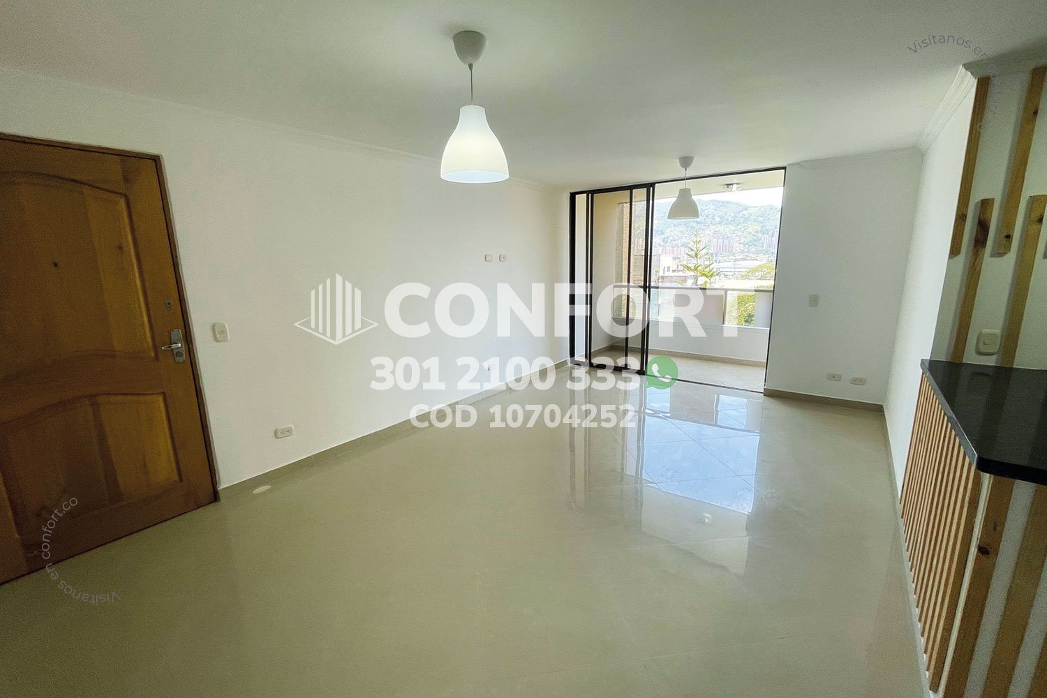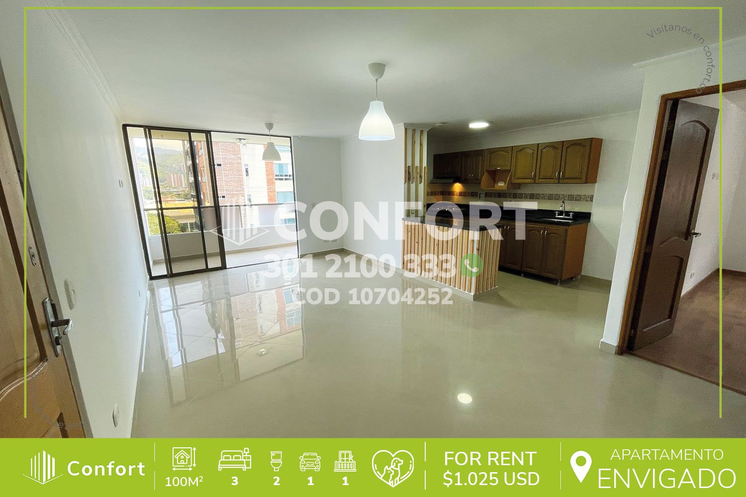 107-04-252 Inmobiliaria en Medellín arrienda apartamento ubicado en el sector de Zúñiga en Envigado, cuenta con un área de 100mt2 distribuidos en sala comedor, cocina integral con barra americana, zona de ropas, 3 habitaciones, una de ellas con baño privado y vestier, 2 con clóset, baño social, habitación de servicio, parqueadero y cuarto útil. Ubicado en edificio con seguridad privada 24/7, donde a su alrededor podemos encontrar Jumbo Las Vegas, São Paulo Plaza y el Mall Villa Grande, con vías de acceso por las avenidas El Poblado, Las Vegas y gran variedad de rutas de transporte público. CONFORT GESTORES INMOBILIARIOS – Arriendo en Envigado