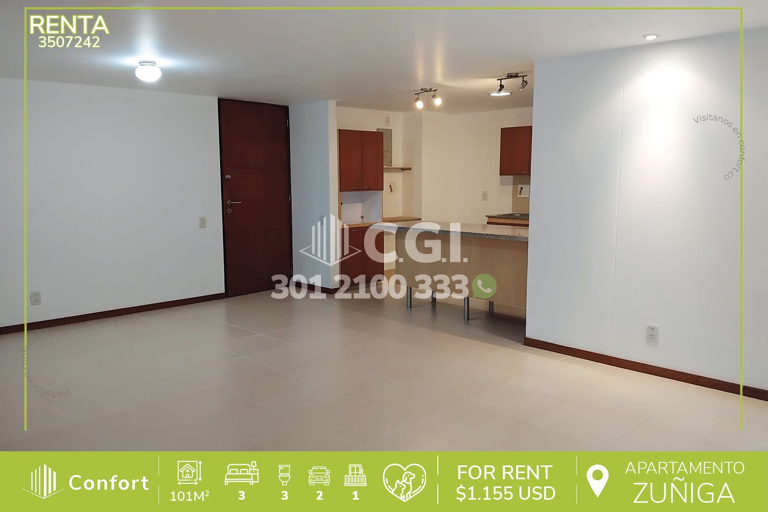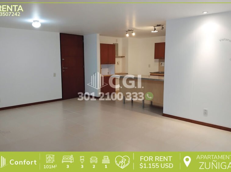 35-07-242 Apartamento disponible para la renta ubicado en el sector de Zúñiga en Envigado, cuenta con un área de 101 mts2 divididos en sala comedor con amplio espacio e iluminación, balcón, cocina integral, zona de ropas, 3 habitaciones, 3 baños, 2 parqueaderos y cuarto útil, ubicado en unidad con seguridad 24/7 y zonas comunes como zonas verdes, salón social, piscina, turco, juegos infantiles y gimnasio. A su alrededor podemos encontrar Carulla, Euro Supermercados, Centro Comercial Sao Pablo, vías de acceso por avenida El Poblado, avenida Las Vegas, avenida la regional y gran variedad de rutas de transporte público. CONFORT GESTORES INMOBILIARIOS – Arriendo en Envigado