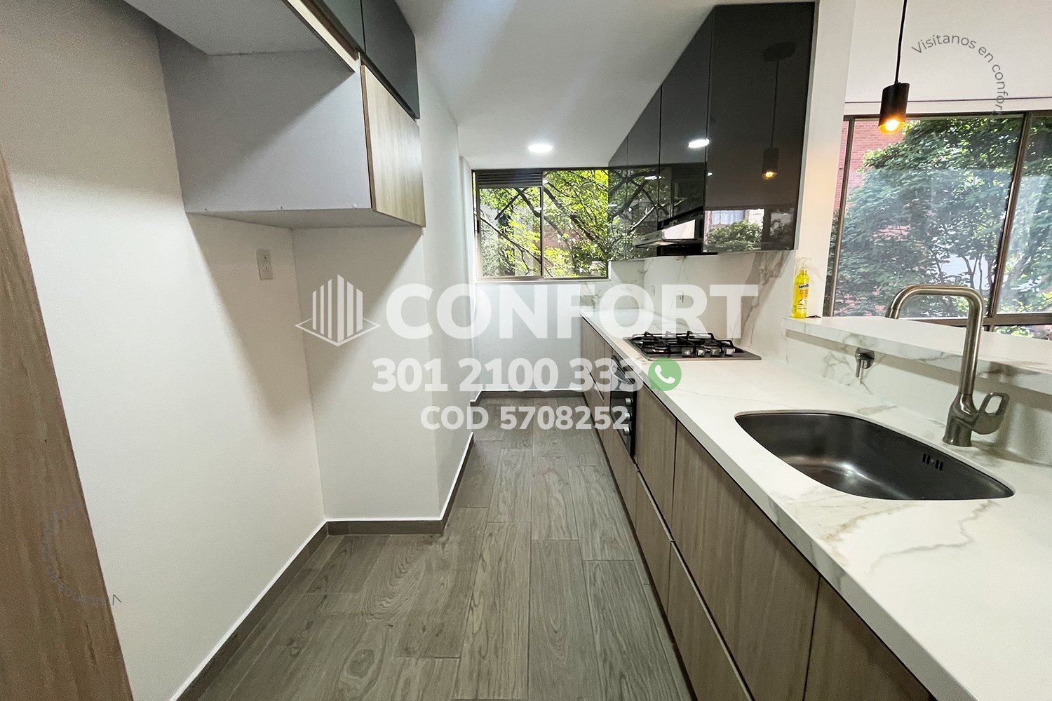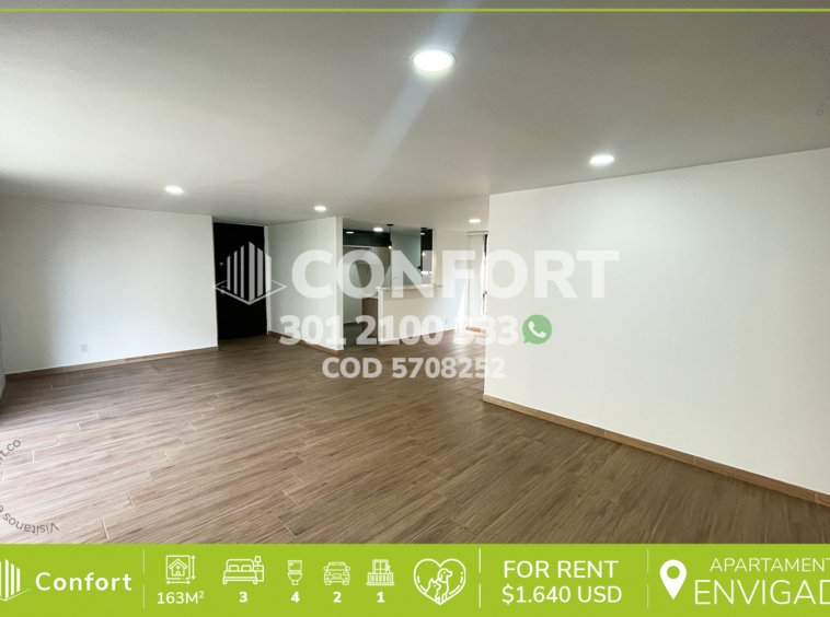 57-08-252 Inmobiliaria en Medellín arrienda apartamento ubicado en el sector de Zúñiga en Envigado, cuenta con un área de 163mt2 distribuidos en sala comedor, cocina integral con barra americana y acabados modernos, zona de lavado, 3 habitaciones con baño privado y vestier, habitación de servicio, baño social, zona de estudio, amplio balcón con hermosa vista, 2 parqueaderos y cuarto útil. Ubicado en unidad con seguridad privada 24/7y zonas comunes como piscina para adultos y niños, gimnasio, salón social y zonas verdes, a su alrededor podemos encontrar el Mall La Frontera, Sao Paulo Plaza y Euro La Frontera, con vías de acceso por las avenidas El Poblado, Las Vegas y gran variedad de transporte público. CONFORT GESTORES INMOBILIARIOS – Arriendo en Envigado