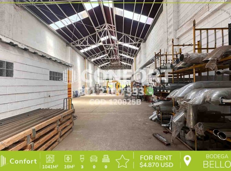12-08-25B Inmobiliaria en Medellín arrienda Bodega, ubicada en Bello, cuenta con un área de 1041mt2, altura de 16mt2 y energía trifásica, ideal para almacenamiento, distribución o procesos industriales livianos, su diseño facilita el flujo interno de trabajo, con áreas amplias, buena altura y acceso cómodo para vehículos de carga, además, cuenta con 3 baños sociales. A su alrededor podemos encontrar la Glorieta de Niquia y el Exito de Puerta del Norte, vías de acceso por la Avenida Regional y gran variedad de transporte público. CONFORT GESTORES INMOBILIARIOS – Arriendo en Bello