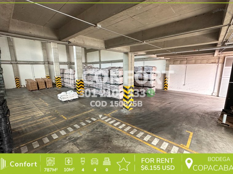15-08-25B Inmobiliaria en Medellín arrienda Bodega, ubicada en Copacabana, cuenta con un área de 787mt2, altura de 10mt2 y energía trifásica. Es ideal para almacenamiento, distribución o procesos industriales livianos, así como para áreas administrativas u oficinas, su diseño optimiza el flujo interno de trabajo, con espacios amplios, altura adecuada y acceso confortable para vehículos de carga, además, cuenta con 4 baños sociales y 4 parqueaderos descubiertos. A su alrededor podemos encontrar la Glorieta de Niquía y el Exito de Puerta del Norte, vías de acceso por la Avenida Regional y gran variedad de transporte público. CONFORT GESTORES INMOBILIARIOS – Arriendo en Copacabana