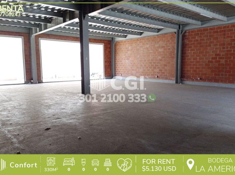 77-08-243 Inmobiliaria en Medellín arrienda bodega ubicada en el sector de La América en Medellín, la cual cuenta con 330 mt2, donde el suelo soporta 500 kilos por metro cuadrado, tiene dos espacios disponibles para instalar dos baños si el cliente los requiere y necesita, está ubicada cerca al parque de la floresta, el Éxito de Laureles, iglesia La América, con vías de acceso por avenida San Juan, avenida 80 y gran variedad de rutas de transporte público. CONFORT GESTORES INMOBILIARIOS – Arriendo en Medellín