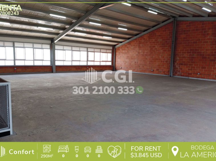 78-08-243 Inmobiliaria en Medellín arrienda bodega ubicada en el sector de La América en Medellín, la cual cuenta con 290 mt2, con dos espacios disponibles para instalar dos baños si el cliente los requiere y/o necesita. Ubicada cerca al parque de la floresta, Éxito de Laureles, iglesia La América, con vías de acceso por avenida San Juan, avenida 80 y gran variedad de rutas de transporte público. CONFORT GESTORES INMOBILIARIOS – Arriendo en Medellín