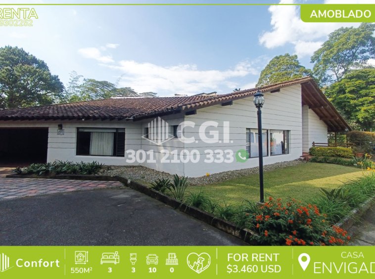 93-02-252 Inmobiliaria en Medellín arrienda casa campestre amoblada ubicada en excelente sector de El Chocho en Envigado, cuenta con un lote de 950mt2 y área construida de 550mt2 distribuidos en sala y comedor independiente, sala de estar, cocina semi integral con alacena, zona de ropas con patio, habitación de servicio con baño privado, 3 habitaciones de excelente tamaño, 2 de ellas con baño privado, la habitación principal de excelente tamaño con su respectivo baño con jacuzzi y área de vestier, adicional podemos encontrar baño social, amplio mezzanine ideal para salón de juegos u oficina, terraza con comedor integrado y amplio jardín privado, incluye garaje para 5 vehículos, parqueadero descubierto para otros 6 vehículos y como factor diferencial, esta propiedad incluye los servicios de agua dentro del canon de arrendamiento. A su alrededor podemos encontrar el Mall Terracina e iglesia La Purísima Concepción, con vías de acceso por la transversal intermedia y gran variedad de rutas de transporte público. CONFORT GESTORES INMOBILIARIOS – Arriendo en Envigado
