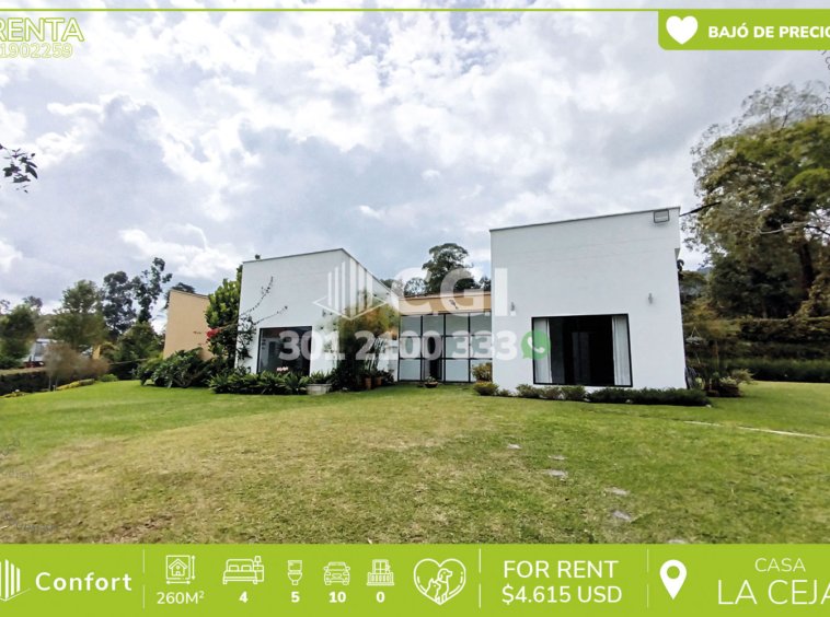 19-02-259 Casa campestre disponible para la renta en La Ceja, Antioquia., cuenta con un área de 2800mts2, con 260mts2 construidos y distribuidos en sala amplia, comedor, cocina abierta semi integral, zona de ropas, cuarto de servicio con baño privado, 4 habitaciones con baños privados, 3 de ellas con clóset y 2 vestier, además, cuenta con una amplia zona verde con jardines y árboles frutales, con parqueadero descubierto para 10 vehículos, ingreso a la casa con control y seguridad privada 24/7. A su alrededor podemos encontrar el Mall Cantarrana y con vías de acceso como Medellín – La Ceja, Rionegro – La Ceja y amplia variedad de rutas de transporte público. CONFORT GESTORES INMOBILIARIOS – Arriendo en La Ceja