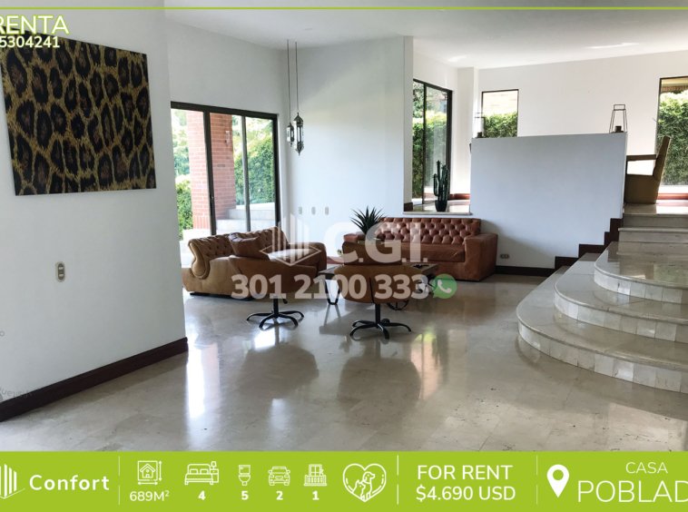 53-04-241 Inmobiliaria en Medellín arrienda casa ubicada en el exclusivo sector de Los Balsos en El Poblado, cuenta con un área de 689mt2 distribuidos en 2 niveles, donde encontramos 2 salas de buen tamaño, comedor, terraza con jacuzzi, cocina integral con excelente iluminación y los más hermosos acabados, patio, zona de ropas, habitación de servicio con baño, 4 habitaciones, cada una con baño privado y 3 de ellas con vestier, baño social, balcón y garaje para 2 carros. Ubicada en unidad cerrada con seguridad 24/7, donde a su alrededor podemos encontrar el colegio Montessori, tiendas D1 y restaurante Marmoleo, con vías de acceso por la Loma Los Balsos, transversal superior y gran variedad de transporte público. CONFORT GESTORES INMOBILIARIOS – Arriendo en El Poblado