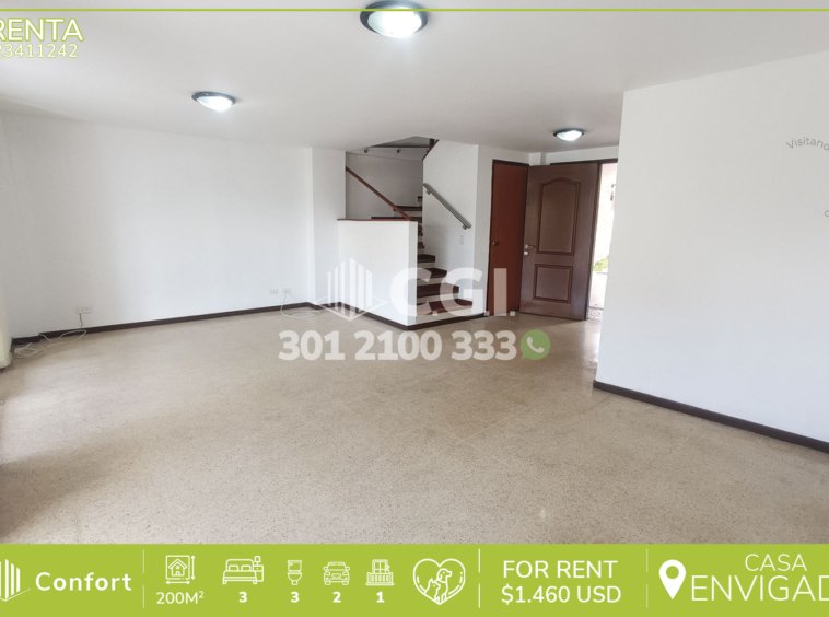 234-11-242 Inmobiliaria en Medellín arrienda casa ubicado en el sector de Envigado en Antioquia, cuenta con un área de 200 mts2 distribuidos en sala comedor, cocina semi integral, balcón, zona de ropas, 3 habitaciones, una de ellas cuenta con baño privado y vestier, las otras dos con closet, 2 baños sociales, sala de estar, terraza semi descubierta, habitación del servicio con su baño privado y 2 parqueaderos cubiertos. Ubicado en unidad cerrada que cuenta con seguridad privada 24/7 y zonas comunes tales como cancha polideportiva, cancha de futbol, kiosko, zona infantil y zonas verdes, a su alrededor podemos encontrar mall Terracina y Farmatodo, con vías de acceso por transversal intermedia y gran variedad de rutas de transporte público. CONFORT GESTORES INMOBILIARIOS – Arriendo en Envigado