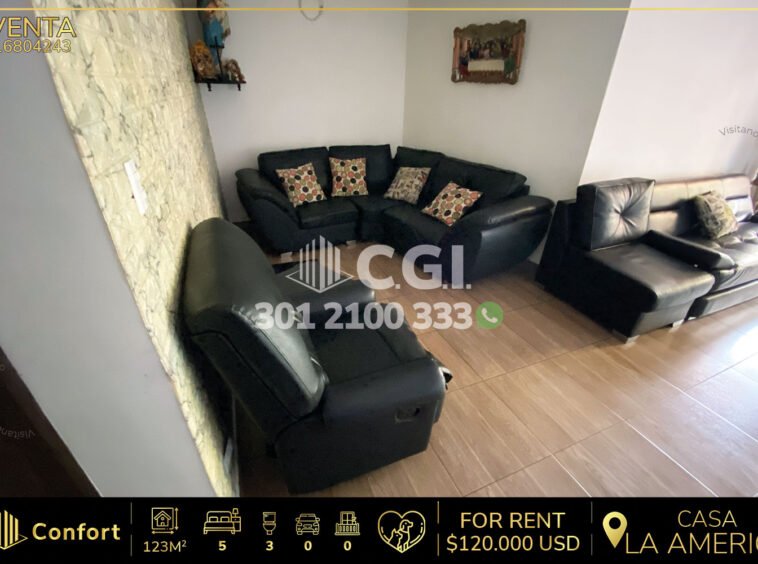 168-04-243 Hermosa y moderna casa disponible para la venta ubicado en el sector de la América en Medellín. Cuenta con un área de 123mt2 distribuidos en cocina integral con full iluminación, zona de ropas, 3 baños, 5 habitaciones, sala comedor, 3 patios, calentador a gas, 5 clósets, terraza pequeña, se encuentra en un sector tranquilo, a su alrededor podemos encontrar Sura de la América, iglesia de la América, mall la 90, con rutas de acceso por Avenida la América, calle 35 y gran variedad de transporte público. CONFORT INMOBILIARIA