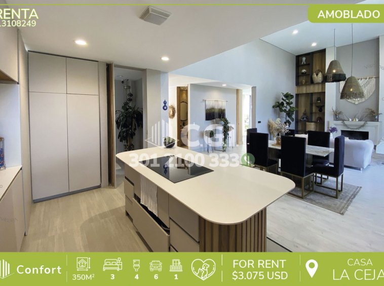 131-08-249 Inmobiliaria en Medellín arrienda espectacular casa inteligente amoblada ubicada en el tranquilo sector de La Ceja, Antioquia. Esta impresionante propiedad cuenta con un área total de 1490 m², con 350 m² construidos, distribuidos en 5 habitaciones, 3 de ellas con vestier y baño privado, baño social, sala comedor amplia, cocina integral moderna en isla, gimnasio y patio trasero perfecto para disfrutar de momentos al aire libre, con balcón con vista panorámica, cuarto útil, parqueadero cubierto y sistema de calentador de gas. Equipada con su propio sistema de tratamiento de agua potable, garantizando comodidad y seguridad en todo momento; a sus alrededores podemos encontrar lugares de interés como la Capilla San Peregrino y el parque de La Ceja, con fácil acceso por la vía La Ceja – Medellín y una amplia variedad de rutas de transporte integrado. CONFORT GESTORES INMOBILIARIOS – Arriendo en La Ceja