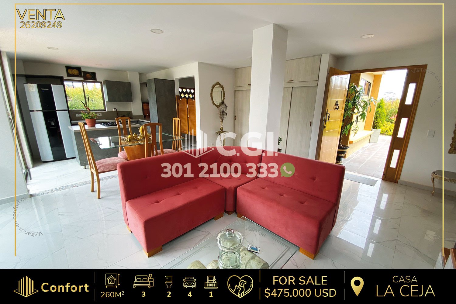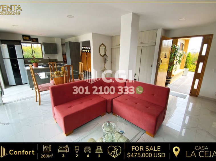 262-09-249 Inmobiliaria en Medellín vende espectacular casa ubicada en el tranquilo sector de La Ceja, Antioquia. Esta impresionante propiedad cuenta con un área total de 1030 m², de los cuales 260 m² están construidos. La casa dispone de una sala y comedor amplia, una cocina semi integral, una práctica zona de ropas, y un balcón que permite una buena iluminación. Además, cuenta con zona de estudio, un baño social, tres habitaciones una de ellas con closet, y la habitación principal con vestier , chimenea y baño privado con jacuzzi. La casa también dispone de un parqueadero cubierto, una zona BBQ, y un cuarto útil para almacenamiento adicional. la casa cuenta con arboles frutales, jardín interno, sauna , turco y un apartaestudio adicional. Además, la propiedad cuenta con una excelente ubicación, con gran variedad de rutas de transporte público como buses y taxis. A sus alrededores se encuentran lugares de interés como la Capilla San Peregrino y el parque de La Ceja, a tan solo 5 minutos en carro. Su ubicación ofrece fácil acceso por la vía La Ceja – Medellín. CONFOR GESTORES INMOBILIARIOS – Venta en La Ceja