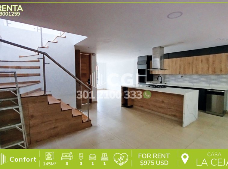 30-01-259 Casa disponible para la renta en La Ceja – Antioquia., cuenta con un área de 145mts2 distribuidos en sala con chimenea y jacuzzi, comedor independiente, cocina semi integral en isla, zona de ropas, patio, 3 habitaciones, 2 de ellas con clóset, la habitación principal cuenta con balcón, vestier y baño privado, además, cuenta con sala de estudio, 2 baños sociales y garaje cubierto. Ubicada en unidad con seguridad privada 24/7 y zonas comunes como piscina para niños y adultos, además de juegos infantiles, a su alrededor podemos encontrar concesionario Renault, vías de acceso como Medellín – La Ceja, Rionegro – La Ceja y amplia variedad de rutas de transporte público. CONFORT GESTORES INMOBILIARIOS – Arriendo en La Ceja