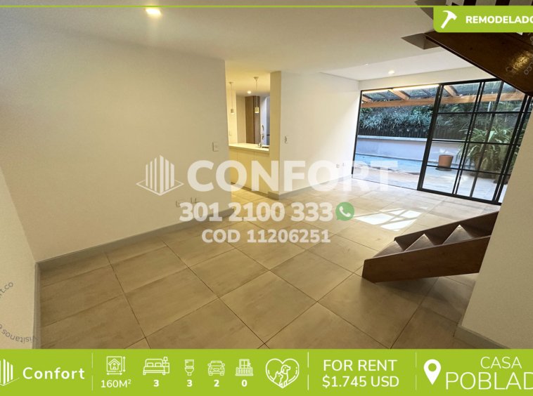 112-06-251 Inmobiliaria en Medellín arrienda casa ubicada en el sector de la Concha en el Poblado. Cuenta con un área de 160mt2 distribuidos en sala, comedor, cocina semi integral con barra americana, zona de ropas, terraza, 3 habitaciones, 2 de ellas con baño privado y una con vestier, además de baño social, sala de estudio, 2 parqueaderos y cuarto útil. Se encuentra ubicada en exclusivo sector y cuenta con seguridad 24/7. A su alrededor podemos encontrar Carulla, Centro comercial Vizcaya, universidad CES, con vías de acceso por avenida el Poblado, transversal inferior y gran variedad de transporte público. CONFORT GESTORES INMOBILIARIOS – Arriendo en el Poblado