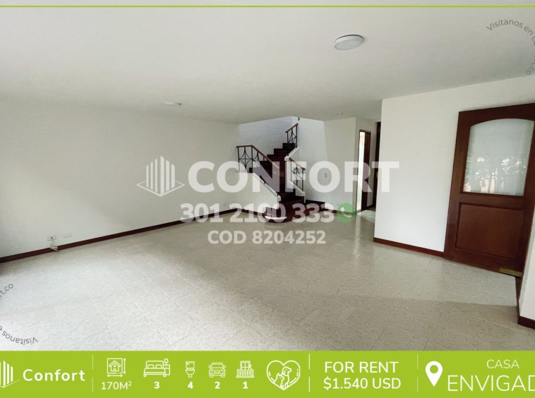 82-04-252 Inmobiliaria en Medellín arrienda casa ubicada en el sector de La Loma del Escobero en Envigado, cuenta con un área de 170mt2 distribuidos en sala comedor, cocina integral, zona de lavado, amplia terraza con zona verde, 3 habitaciones, 2 de ellas con vestier y baño privado, la principal con balcón, 2 baños sociales, sala de estudio, baño de servicio y parquero cubierto con espacio hasta para 2 vehículos. Ubicada en urbanización con seguridad privada 24/7 y zonas comunes tales como piscina para adultos y niños, parque infantil, salón social y zona de mascotas, a su alrededor podemos encontrar el centro comercial City Plaza y Tiendas D1, con vías de acceso por la transversal intermedia, Loma del Escobero y gran variedad de rutas de transporte público. CONFORT GESTORES INMOBILIARIOS – Arriendo en Envigado