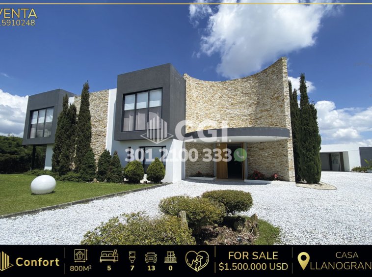 159-10-248 Espectacular casa disponible para la venta, ubicada en el exclusivo sector de Llano Grande, Antioquia. La propiedad cuenta con un área total de 2100 m² y 800 m² construidos, distribuidos de manera excepcional. Ofrece una cocina integral, 2 amplias salas que conectan con un amplio comedor, zona de ropas, 4 habitaciones con baño privado y vestier, 2 alcobas de servicio con baño y una de ellas con clóset, 2 baños sociales y 3 baños de servicio, zona de estudio, área con jacuzzi, gimnasio y sala de cine. Toda la casa está completamente domotizada, lo que permite un control automatizado de las distintas áreas de la propiedad, incluye 13 parqueaderos y cuarto útil. Ubicada en parcelación con seguridad privada 24/7, cerca de la Sede Águilas Doradas y el Vivero Colibrí, con fácil acceso por la vía San Nicolás – La Ceja y amplia variedad de rutas de transporte público. CONFORT GESTORES INMOBILIARIOS – Venta en Llano Grande