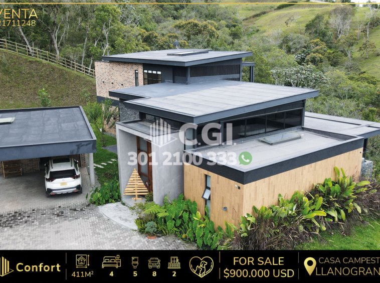 217-11-248 Espectacular casa campestre disponible para la venta en Llano Grande, Antioquia., cuenta con un área de 5.000 m² de terreno y 411 m² construidos y distribuidos en sala comedor, comedor, cocina integral equipada (horno, lavavajillas y campana), 4 habitaciones con su respectivo baño privado, habitación de servicio con baño privado, zona de estudio, 2 balcones, jacuzzi, chimenea, jardines internos, fogatero, árboles frutales, sistema de alarma con cámaras, 2 parqueaderos cubiertos y 6 descubiertos. Ubicada cerca de la Reserva Santa María Eco Hotel, con vías de acceso por la vía La Ceja – Rionegro y amplia variedad de rutas de transporte público. CONFORT GESTORES INMOBILIARIOS – Venta en Llano Grande