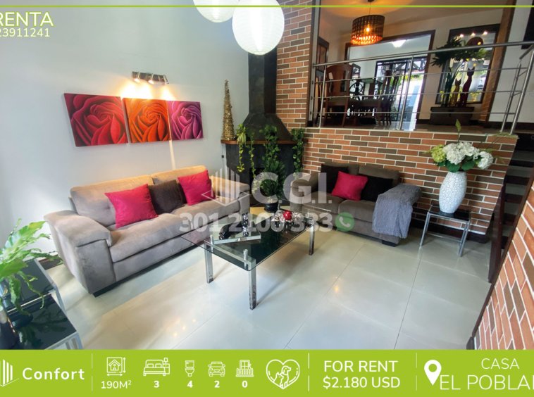 239-11-241 Inmobiliaria en Medellín arrienda casa ubicada en el sector de Los Balsos en El Poblado, cuenta con un área de 190mt2 distribuidos en sala, comedor, cocina integral, zona de ropas, terraza, 3 habitaciones cada una con su respectivo baño privado, una de ellas con vestier, 2 con clóset, sala de estudio, baño social, mezzanine y 2 parqueaderos. Ubicada en unidad con seguridad privada 24/7 y zonas verdes, a su alrededor podemos encontrar Complex Los Balsos, parque recreativo Providencia y el centro comercial El Tesoro, con vías de acceso por la transversal superior, avenida El Poblado y gran variedad de rutas de transporte público. CONFORT GESTORES INMOBILIARIOS – Arriendo en El Poblado