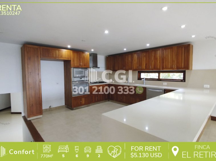 135-10-247 Casa finca disponible para la renta en el sector de El Retiro, esta hermosa casa finca con un área construida de 770mtr2 construidos y un lote total de 8770mtr2, en la parte superior de la propiedad cuenta con 4 habitaciones con vestier y baño privado y un excelente balcón con una hermosa vista hacia La represa de La Fe, en la parte inferior cuenta con agradable sala con chimenea, cuarto de televisión con un baño social, cocina integral, comedor, zona de ropas amplia, alcoba de servicio con clóset y baño privado, además, cuenta con alcoba de visitas con baño privado, clóset de linos, despensa, jacuzzi y turco, con parqueadero cubierto para 3 vehículos y 6 descubiertos, con portería eléctrica y casa de mayordomos. Ubicada en unidad con seguridad privada 24/7, cerca a la parcelación Juanito Laguna y La bomba de La Fe, con vías de acceso como Medellín – La Fe, Rionegro – La Fe y amplia variedad de rutas de transporte público. CONFORT GESTORES INMOBILIARIOS – Arriendo en El Retiro