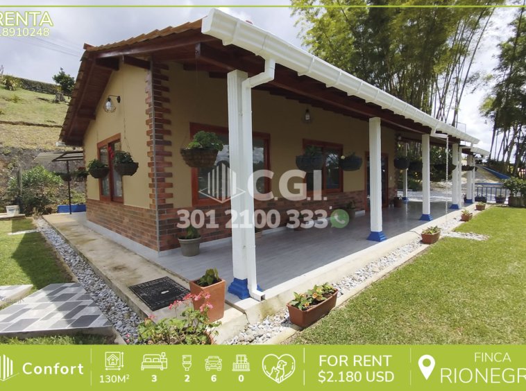 189-10-248 Hermosa finca disponible para la renta en Rionegro, Antioquia., cuenta con un área total de 1.500 mts2 y 130 mts2 construidos y distribuidos en sala comedor, zona de ropas, cocina semi integral, baño social, 3 habitaciones con clóset, una de ellas con baño privado y 6 parqueaderos. Ubicado en unidad con seguridad privada 24/7, fogatero, jacuzzi y zona BBQ, a su alrededor podemos encontrar la vía de la avícola Kakaraka, con vías de acceso como la autopista Medellín – Bogotá, Medellín – Rionegro y gran variedad de rutas de transporte público. CONFORT GESTORES INMOBILIARIOS – Arriendo en Rionegro