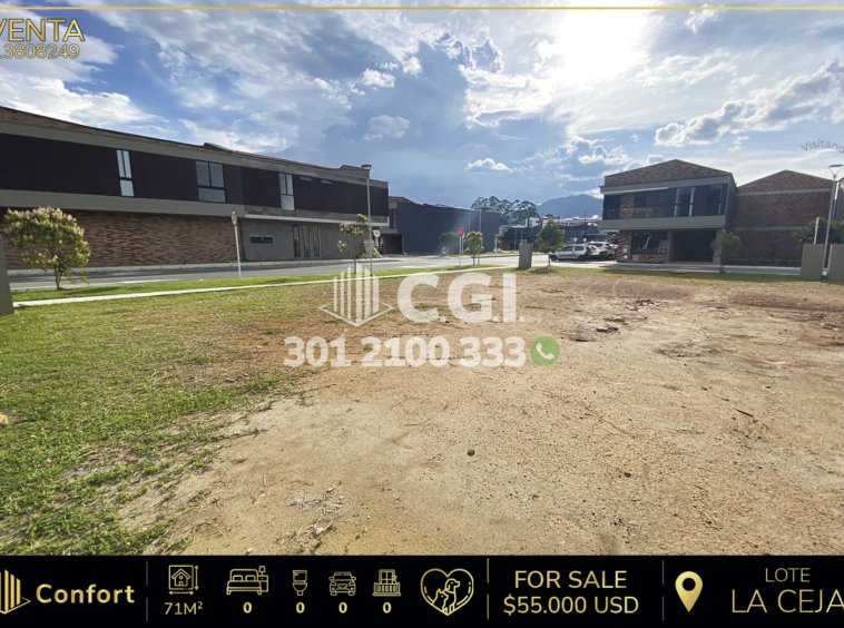 138-08-249 Inmobiliaria en Medellín vende excelente lote ubicado en la Ceja, Antioquia, con un área de 71 mts2, totalmente nuevo para construir. Ubicado en unidad cerrada con seguridad 24/7 y zonas comunes tales como turco, gym, salón social y parque infantil; a sus alrededores podemos encontrar la unidad deportiva de La Ceja, Comfama de La Ceja y al Mall Ciudad Jardín, con fácil acceso por las calles 16, 17a y gran variedad de opciones de transporte público. CONFORT GESTORES INMOBILIARIOS – Venta en La Ceja
