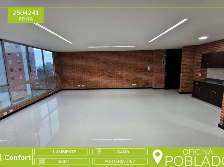 25-04-241 Confortable oficina de 63mts² ubicada en punto estratégico de la ciudad en El Poblado, sector San Julián, este hermoso inmueble cuenta con un espacio abierto, cocina sencilla, baño con ducha y una iluminación y vista espectacular. El edificio empresarial tiene portería 24/7, lobby, zona de comedor, parqueadero de visitantes y ascensor. Por su ubicación tiene cercanía a centro comercial Premium Plaza, Centro comercial Automotriz, Clínica Oftalmológica San Diego y fácil acceso por la Avenida El Poblado y Avenida Las Palmas, además de múltiples rutas de transporte integrado. CONFORT INMOBILIARIA
