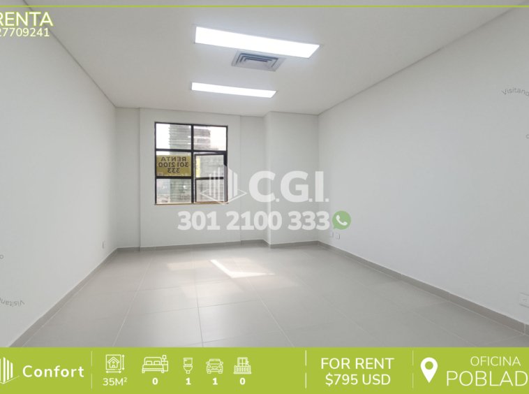 277-09-241 Inmobiliaria en Medellín arrienda oficina ubicada en excelente sector de El Poblado, cuenta con un área de 35mt2 distribuidos en 2 espacios amplios, cuenta con baño social, aire acondicionado y parqueadero privado. Ubicado en edificio que cuenta con seguridad 24/7, un salón social disponible para conferencias y parqueadero para visitantes, a su alrededor podemos encontrar el parque de El Poblado y parque La Presidenta, con vías de acceso por las avenidas El Poblado, Las Vegas y gran variedad de rutas de transporte público. CONFORT GESTORES INMOBILIARIOS – Arriendo en El Poblado