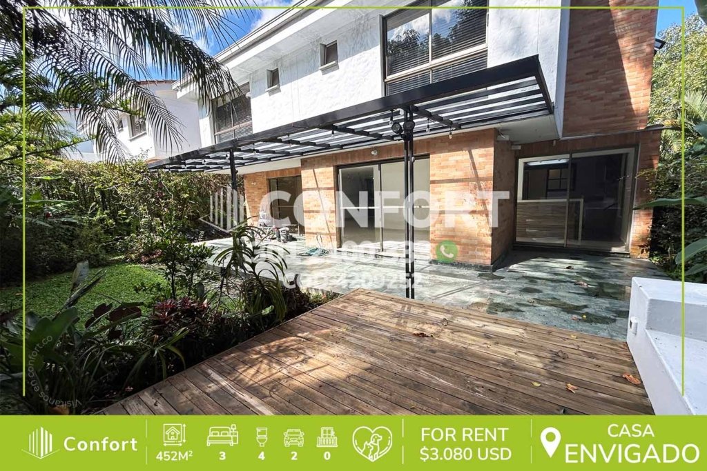 44-09-252 Inmobiliaria en Medellín arrienda casa ubicada en Envigado, sector Benedictinos. El inmueble tiene un área de 336mt2 distribuidos en una sala, comedor, cocina semi integral, zona de ropas, terraza, patio, 4 habitaciones con baño privado y vestier, closet, 1 baños sociales y 4 parqueaderos. El edificio ofrece vigilancia 24/7 y zonas verdes. A su alrededor podemos encontrar el Colegio...