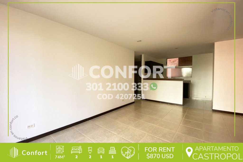 42-07-241 Inmobiliaria en Medellín arrienda apartamento en el sector de Castropol en el Poblado. Cuenta con un área de 74mt2 distribuidos en sala comedor, cocina integral, zona de lavado, 2 habitaciones, la principal de ellas con baño privado y vestier, además 1 baño social, balcón, parqueadero y cuarto útil. Ubicado en unidad cerrada con seguridad privada 24/7 y zonas comunes como piscinas para...