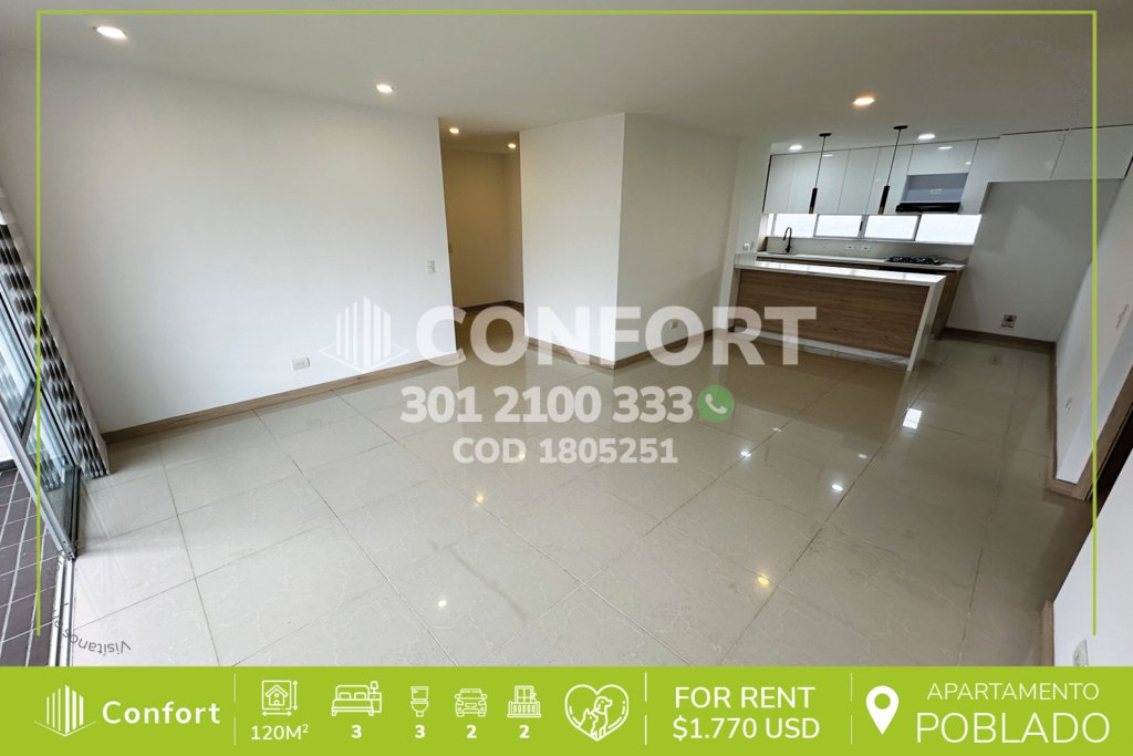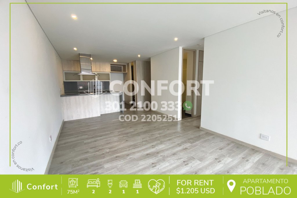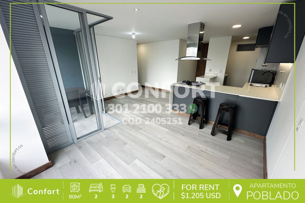 24-05-251 Inmobiliaria en Medellín arrienda apartamento ubicado en excelente sector de Ciudad del Río en El Poblado, cuenta con un área de 80mt2 distribuidos en sala comedor, cocina integral con barra americana, zona de ropas, balcón social, 2 habitaciones cada una con baño privado y una de ellas con vestier y balcón privado, baño social, 2 parqueaderos y cuarto útil. Ubicado en unidad con...