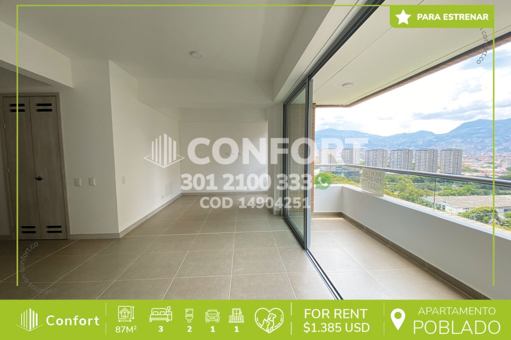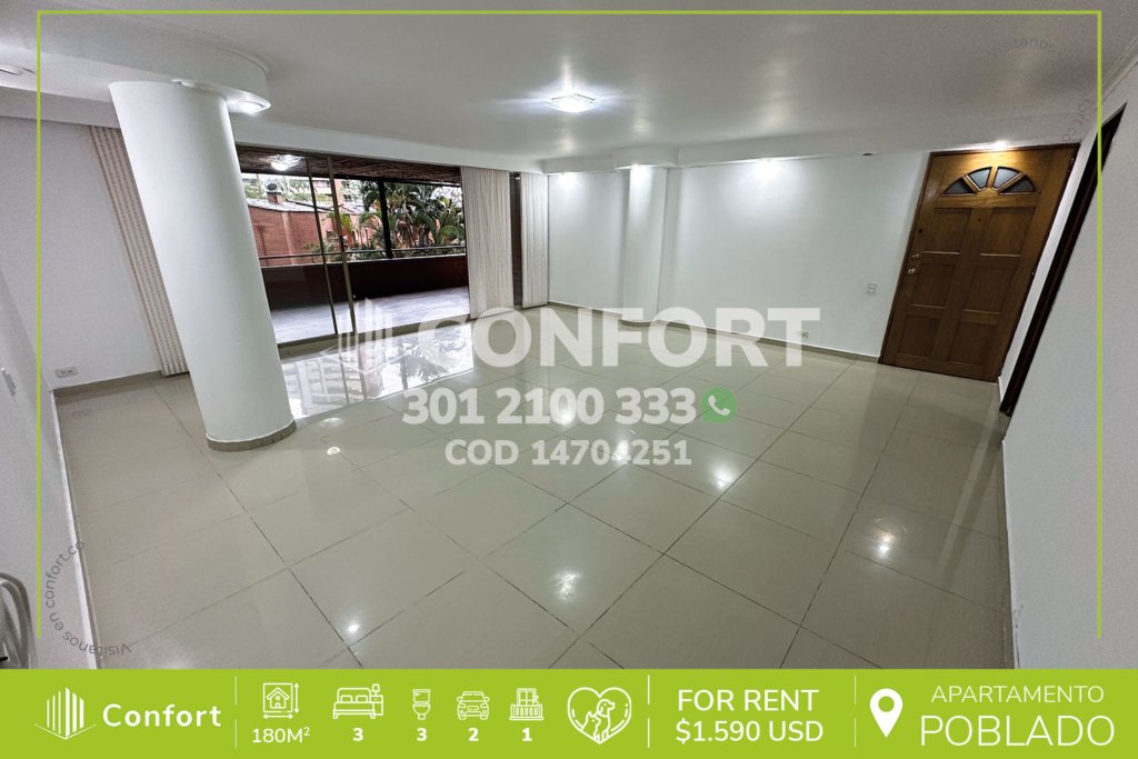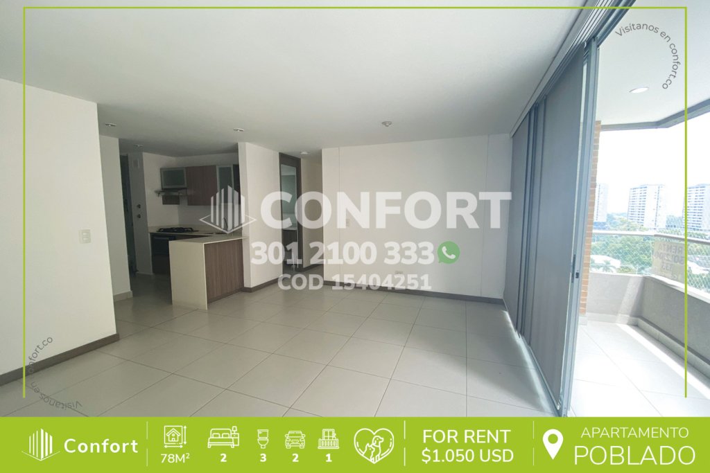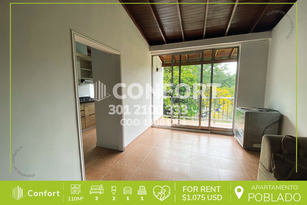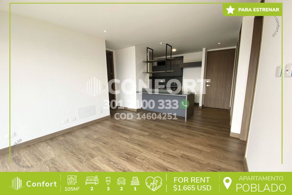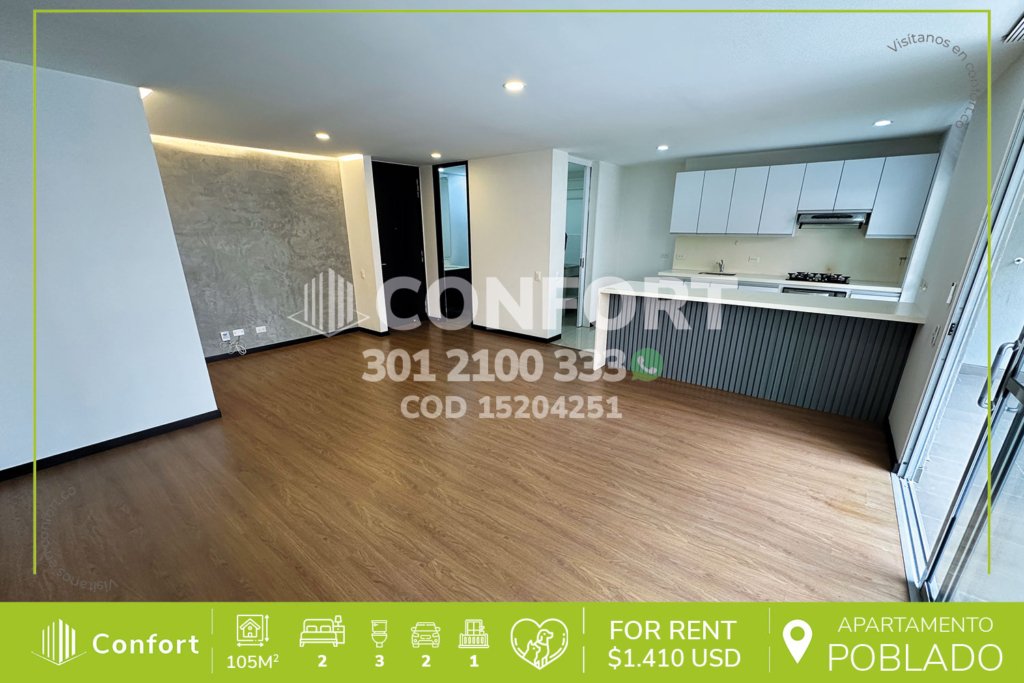 156-04-251 Inmobiliaria en Medellín arrienda apartamento ubicado en el sector de Altos del Poblado, cuenta con un área de 108mts, distribuidos en sala comedor muy amplia, sala de estudio, balcón con zona BBQ, cocina integral con terminados de lujo y barra americana, 2 habitaciones con vestier y baño privado, baño social, parqueadero doble lineal y cuarto útil. Ubicado en unidad con seguridad privada...