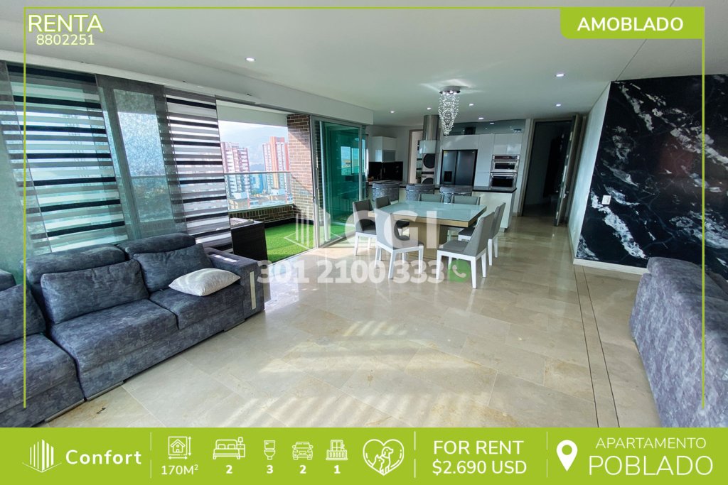 88-02-251 Inmobiliaria en Medellín arrienda apartamento amoblado ubicado en el sector de Castropol en El Poblado, cuenta con un área de 170mt2 distribuidos en sala, comedor, cocina integral con barra americana y hermosos acabados, zona de ropas, balcón, 2 habitaciones cada una con su respectivo baño privado y vestier, baño social, sala de estudio, habitación de servicio con su respectivo baño...