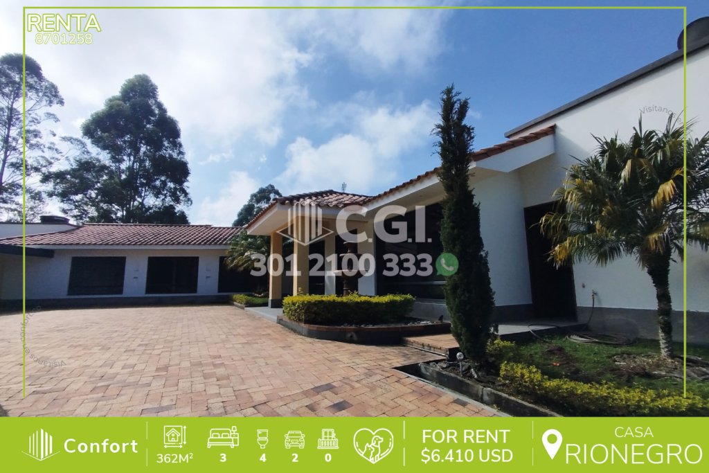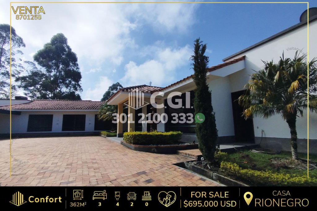 87-01-258 Casa disponible para la venta en Rionegro, Antioquia., cuenta con un área total de 2535mts2 con 362mts2 construidos y distribuidos en sala comedor amplia con chimenea, cocina integral, zona de ropa, habitación de servicio con baño privado, amplia terraza con hermosa vista, baño social, zona de estudio, 3 habitaciones con vestier y baño privado, baño social, parqueadero cubierto para 2...