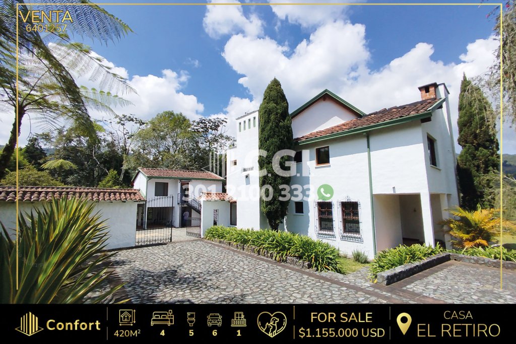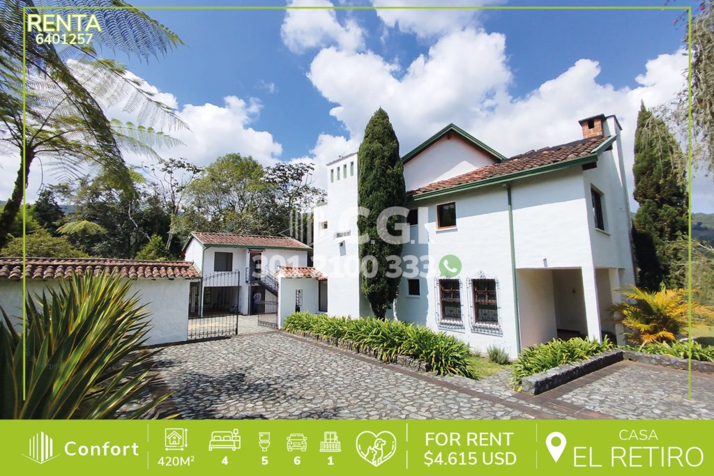 71-01-257 Casa disponible para la renta en una de las mejores parcelaciones de El Retiro, Antioquia., cuenta con un área total de 6000mts2 de los cuales consta de 300mts2 construidos y distribuidos en sala con chimenea, comedor, 2 salas de estar, cocina semi integral amplia, zona de ropas, habitación del servicio con baño privado, baño social, 4 habitaciones con clóset y 3 de ellas con baño privado,...