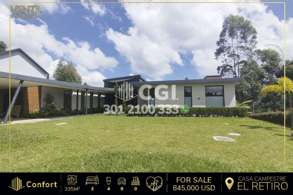 57-12-247 Casa campestre disponible para la venta ubicado en el sector de El Retiro - Antioquia, cuenta con un área de 1.750 mts2 de los cuales 335 están construidos y distribuidos en sala comedor, cocina integral con isla, chimenea a gas, zona de ropas, 3 habitaciones, cada una con su baño privado y vestier, baño social, habitación del servicio con baño privado, cuenta con domótica en toda la casa,...